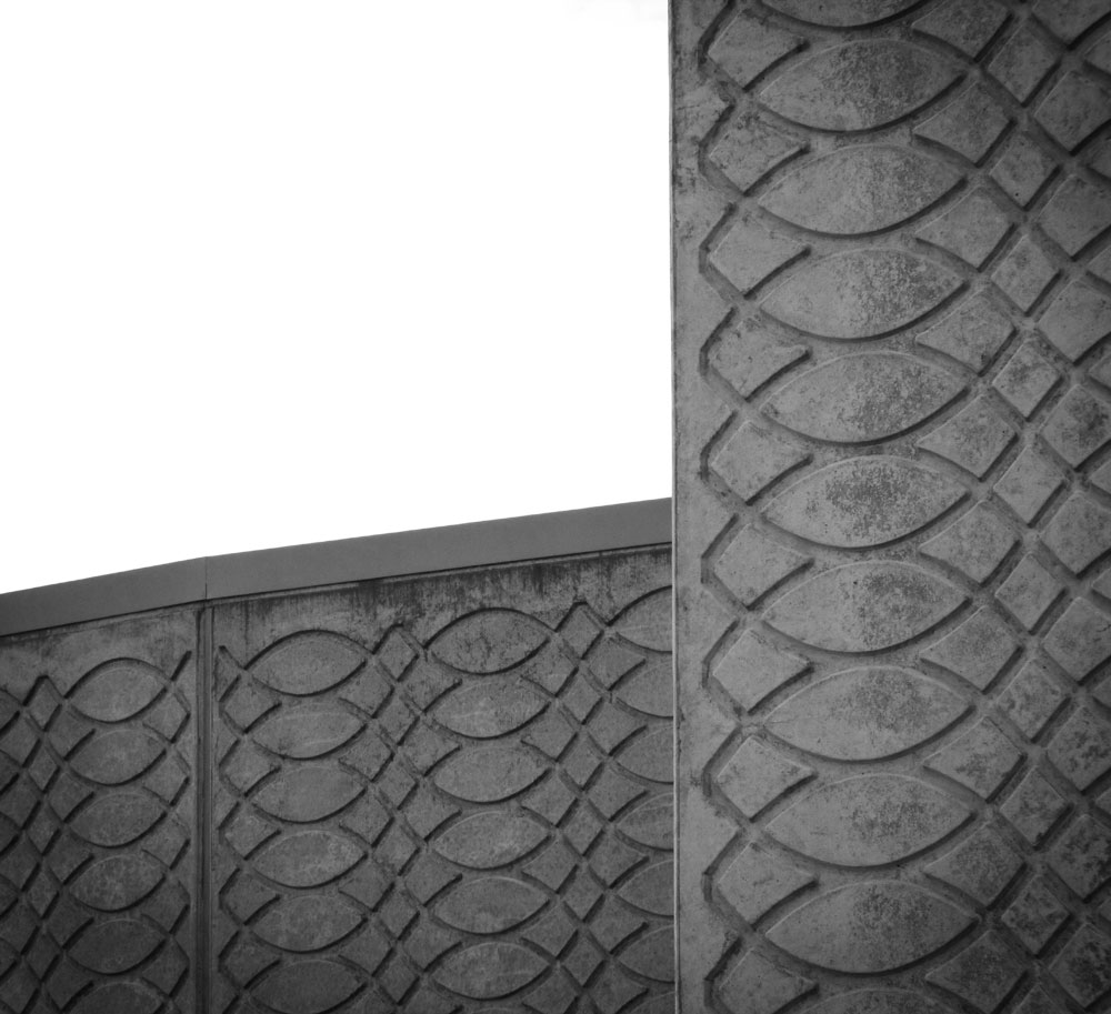 The road swoops again, seemingly deflected by the curving concrete bastions of St Joseph’s. From the air, the plan is a mashup of cross and koru, but at ground level it seems defensive, a shield of blast walls to shelter the congregation from the seething traffic. The concrete is engraved with a pattern that could be waves, scales, or fish, but if they are indeed Jesus fish, then they’re very mixed-up Ichthys: through repetition and Escheresque overlaps, they could be swimming either up or down the highway.