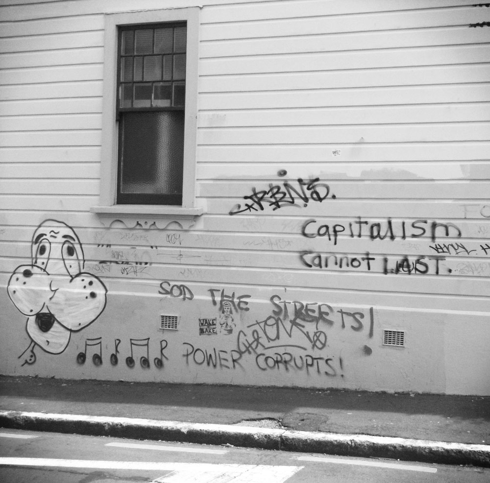 Thistle Hall announces that it’s “looking to the future with progressive ideals”, but the names of the new (second hand) shops that are slowly re-inhabiting this damaged intersection betray a more ambivalent attitude to time’s arrow: Aeon, Particles of Time. Erasure in the guise of preservation: shops and cottages were shunted, refurbished and in some cases rebuilt to form a “heritage precinct”, but it’s a blinkered “heritage” that celebrates colonialism while whitewashing living history. Transit’s twee little potted histories, now vanishing from the windows as urban life returns, petered out in the early twentieth century, passing over the politics, culture, art and struggles of the Upper Cuba most of us remember. Only the former Freedom Shop retained signs of that resistance: on an interior wall that was yet to be sanded clean, a few stickers remained, including the infamous black bloc chant “Capitalism? No thanks! We will burn your fucking banks!” That too is now gone.