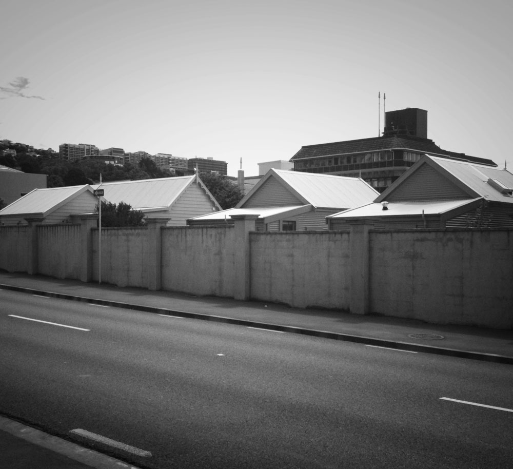 The road keeps snaking on, leaving an awkward geometry of concave triangles and apologetic landscaping. Among the fumes, the sticky, shimmering asphalt and the brazen architectural mediocrity of motels and hostels, a small crenellated building strikes an anomalous note of embattled whimsy. The defensive architecture seems at odds with its history as Mother Aubert’s Home of Compassion, but perhaps it will indeed have to dig itself in for another siege. While NZTA are tight-lipped about current flyover options, it seems likely that this bijoux castle will be (literally) in the road. As St Pat’s college got the elbow in the 60s, exiled to Kilbirnie to make way for a stillborn motorway, perhaps this last remnant will also be shoved aside. With its context so mutable, what’s to keep it rooted to this particular piece of earth?
