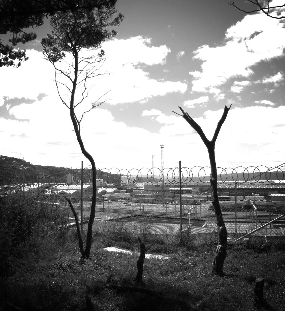 I had planned to simply follow this last stretch of motorway path to the end of the bluff, then down to Thorndon Quay, but when I’m nearly there I notice a roughly-beaten path that leads up through the scraggly vegetation to my right. I scramble up, ducking under branches, and come across the unavoidable signs of habitation. An improvised hammock; the battered metal frame of an office chair; bottles, bags and the dry ashes of bonfires. The scrub opens up, through trees reduced to bony stumps, revealing a hidden grassy clearing, a lookout wedged between high fences, cliffs and razorwire. From here I can see the wide grey tumble of the railyards, the hills and glassy harbour, and the motorway swooping out on concrete legs, reaching for the distance. It’s a commanding view, but the detritus around me tells me that for the occupants of this invisible eyrie, this is not the sort of “looking down on Wellington” that the t-shirt was talking about.