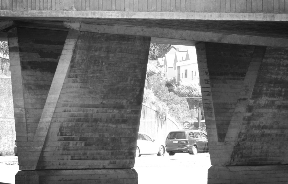 The path beside the motorway is littered with plaques. One bears a name that can still send shivers through anyone of a certain age: OFFICIALLY OPENED BY RT HON R D MULDOON C.H., PRIME MINISTER. Others are self-congratulatory, crowing of engineering awards (“Outstanding design and care for the surroundings have restored and enhanced the quality of the environment traversed by this new road”). And indeed Einhorn seems to have been having fun here, especially with the variety of supports for the overbridges. I give them names: this is the Herringbone, this the Springboard; these are the Cubist Trousers and this one’s the Flying V.