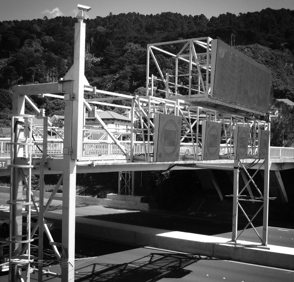 Recent additions lack anything resembling whimsy, or indeed any semblance of grace. New electronic signs are borne on lumbering metal gantries, grotesquely over-engineered and encrusted with cameras and barbed wire. It’s as if a few LEDs carry the entire weight of the motorway system, the bits and bytes of traffic data carved in stone rather than flickers of light and electricity. It carries me back to the billboards at the start of the highway — massive legs bearing flimsy advertising messages — and all the heavy metal infrastructure required to gather, transmit and display incorporeal information. Cellphone towers, repeater stations, stumpy pillars for incongruously dainty cameras. It seems that the symbolic economy is far from weightless.