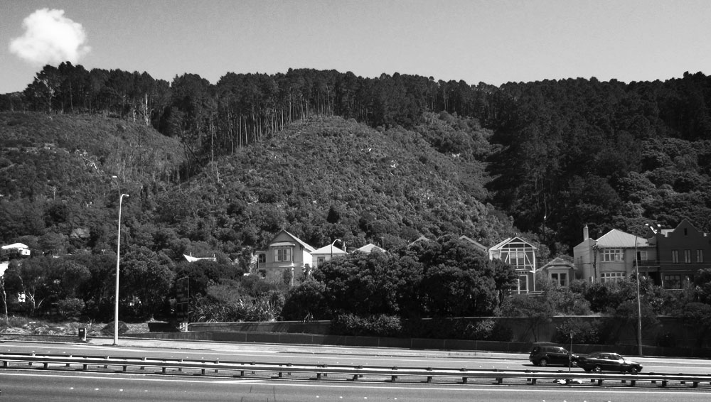 The path bends with the motorway, peeling away from the hills, presenting a widescreen panorama of residential Thorndon. I can see what remains of the gullies into which the highway has wedged itself: from the all-but-vanished Honeyman’s Gully (once a duelling ground for lawyers, then filled in for the less fatal contests of Anderson Park), Sydney Street’s dank valley, then settling down beside Tinakori Rd and on through the former Hobson St gully, which until the motorway came through could only be crossed via swing bridge. Behind it all, Te Ahu-mai-rangi (aka Tinakori Hill, aka Mt Wakefield) looms like a vast green wave, now partly denuded in the hope of a native renaissance, but still concealing quarries and tunnels (the lust for gold) in its darkly hidden folds.