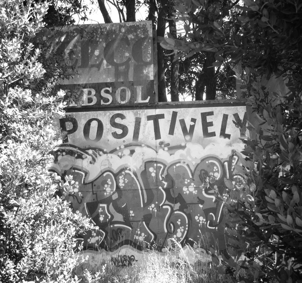 The rail lines begin to diverge, the Hutt-bound tracks now hugging the pavement while the Main Trunk loops away and climbs a gentle bank, winding up for its leap into the hillside. I check the Hutt line both ways, check again for anyone watching, and hop across the white railing and the narrow tracks. I enter the non-land, the “verge” in many senses, a parkland glimpsed from car or carriage but never intended for human habitation. The combination of soft lush grass and modest copses should evoke the eternal savanna, the evolutionary Eden of Duttonesque reverie, but instead it’s an uncanny valley of landscaping wrongness. Captured rivulets trickle blindly among weeds; cars growl and thunder just out of sight; rails and warning signs admonish interlopers; the only spoor is rabbit droppings and graffiti on rotting billboards.