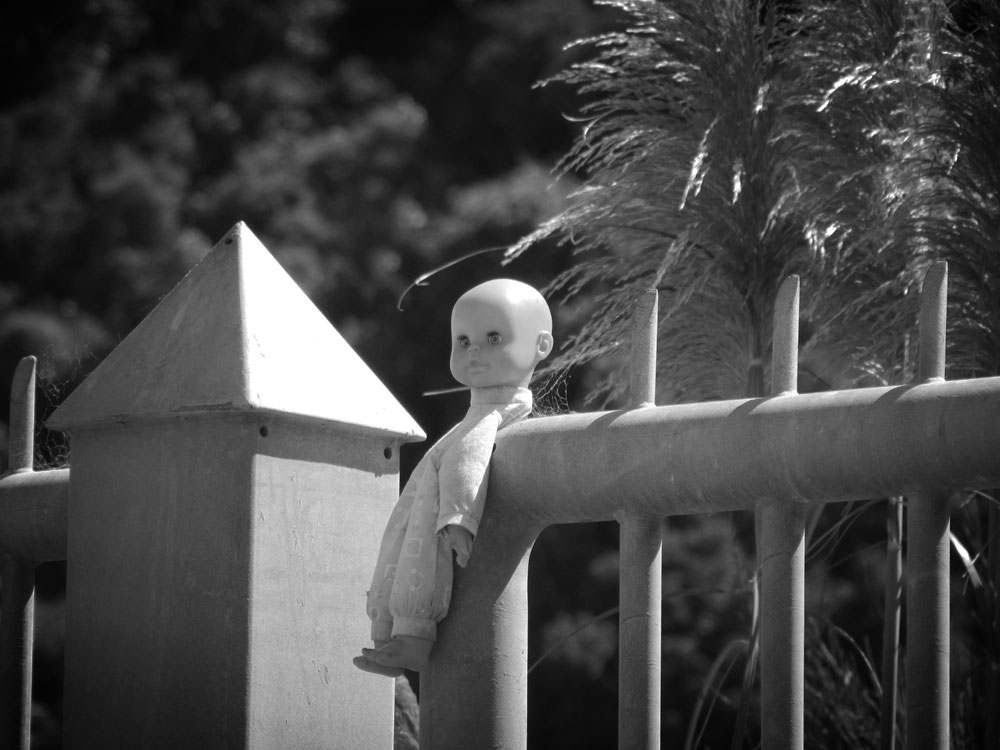 Motionless. Through dead still air the sounds of the highway come drifting up, mingling with cicada song in the fierce flat heat of summer. The built environment is mostly predictable, the edgelands lingua franca of asphalt and corrugated metall, but amid all this there are touches of exurban surrealism. The substation is done up like a PoMo swimming pool, its elemental power of transformation (and transformation of power) domesticated in baby blue tiles and stucco, camouflaged with faux-Deco and cod-Classical flourishes. And then I’m struck by the unsettling innocence of a baby doll, impaled in either macabre humour or unhinged malice upon the railings of an unknowable depot.
