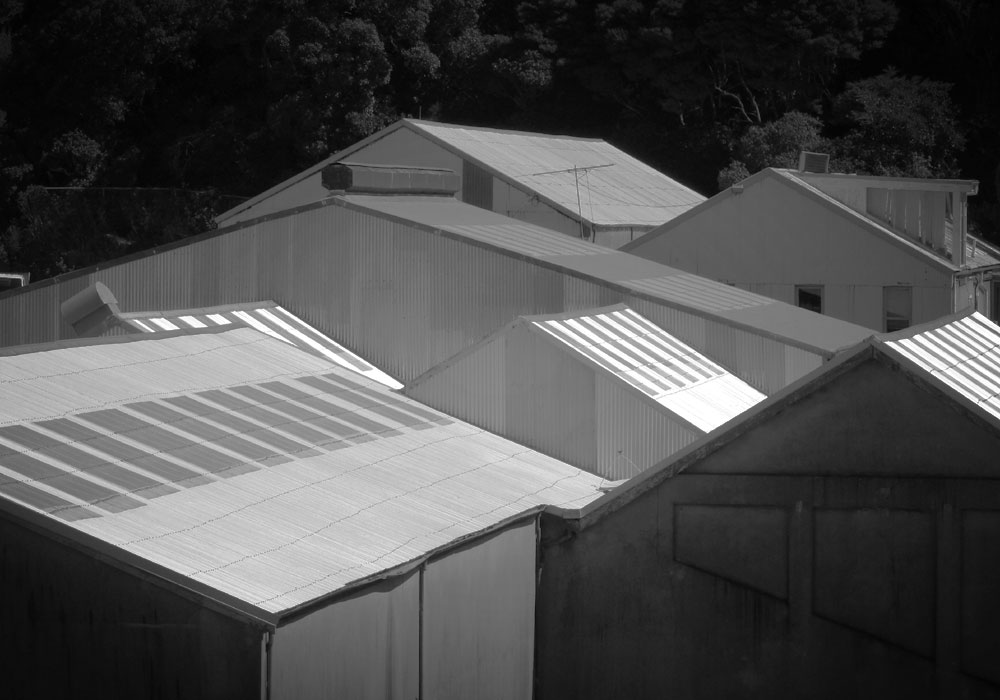 I detour up Tyers Rd, investigating the anonymous sheds that sit on an artificial plateau. They huddle at the base of the upper cliffs, ziggurat forms roughly carved from frangible bedrock. From the upper road, the big sheds on the old tannery site below almost achieve an abstract beauty: warehouse rooftops coaxed into a shimmering composition of angular forms. They’re part of an industrial park sometimes called “Transport Village”, though of course it’s all transport and no village.