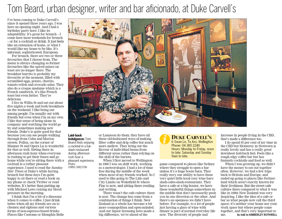 (Just kidding) Like parents — or how we imagine them to be — we are immensely proud when one of our snotty brats achieves recognition for the things at which they excel. And in this case, Oor Tom has been featured in the My Favourite Table section in Wednesday’s Dom Post Capital Life supplement, being recognised for two of the things he does best: sitting in bars, and drinking.
