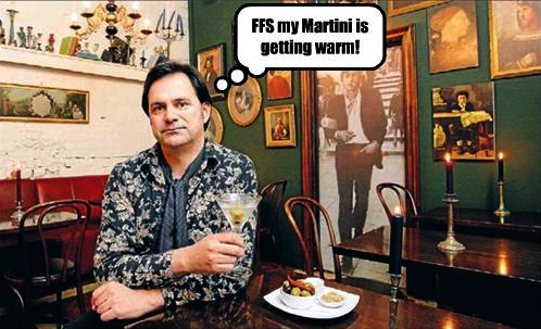 I added that thought-balloon, imagining Tom sitting gamely through his location shoot with a photographer (one Chris Skelton in this instance, back from whom we’re waiting to hear about permission to use this photo), the interminable exposure of the digital equivalent of several rolls of film, barely controlling the gin-related drool emanating from the corner of his mouth. And all the while, a rapidly-tepidifying Martini waits. (He was in reality probably thinking far more lofty thoughts, such as how to solve the Buckle Street to Airport transport corridor problem.)