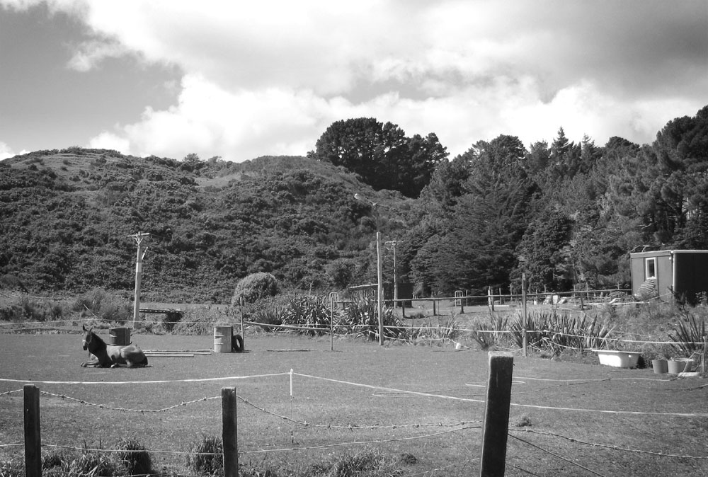 Behind the house, past the poplars and ubiquitous macrocarpas, there’s a glimpse of timeless bucolic Kiwiana. Horses amble along well-worn dusty paths, shelter belts and broom step up the rolling slopes, streams wind lazily through what by Wellington standards has always been a gentle and well-watered hollow, and which must have seemed a perfect place to settle or just stop for the night.
