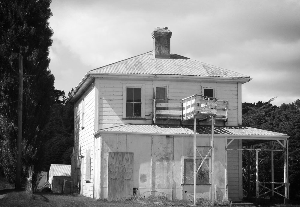 For a physical reminder of The Halfway, I walk past the garden centre, ignore the barrage of “Private Road” warnings, and head for the picturesque husk of a house at the end of a narrow metal road. This is the last of several Halfway Houses that once provided welcome shelter and possibly even more welcome booze for travellers, halfway between Porirua and Wellington. At the moment it looks halfway to ruin, and a long way from a decent drink. Plywood windows, tumbling pillars, weatherboards lost in lichen, a chimney crumbling back to clay.