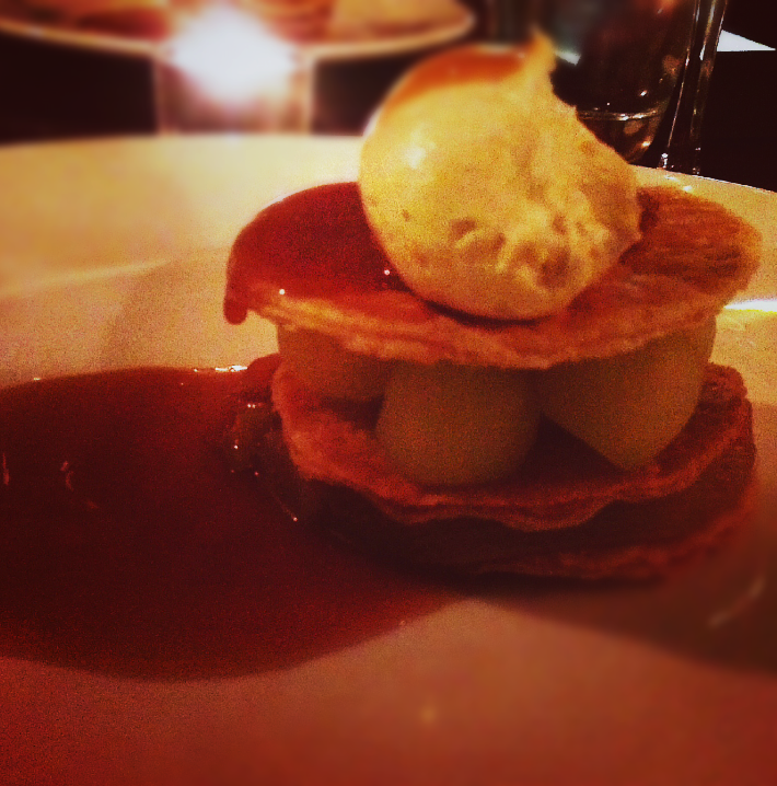 And finally; the dessert. Oh the dessert. Rhubarb and Apple Mille-Fueille with Salted Caramel and Rhubarb Cream. There is not much in this world that I love more than salted caramel and this was some of the best I’ve tasted – thick, properly salty and full of toffee goodness. The wee balls of crisp apple, coupled with rhubarb and layers of wafers were, with their tart, light flavours, an ideal follow up to the game courses. The photo does not do it anything close to justice.