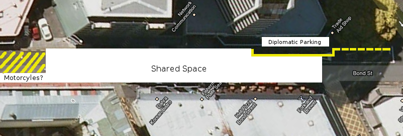 Why do we actually need parking spaces on Bond Street? Taxi rank overflow was blocking any real use of the pay-and-display parking spots and the rank needs to be moved to close the Bond and Willis intersection, so I don’t see a plausible argument for current parking revenue. For loading zone activity, lines don’t need to be drawn in explicitly. We certainly don’t have parking lines on Woodward Street and the early-hour loading zone use of Cuba Mall works without lines of any sort. The only argument for drawn parking spaces is for diplomatic parking. The council proposal moves those parks to the north side of the street, in front of Trade Aid. I think that location is fine, assuming there’s an obligation to keeping the diplomatic parking. It’s on the shaded side of the street and leaves the sunny space for people and activities.